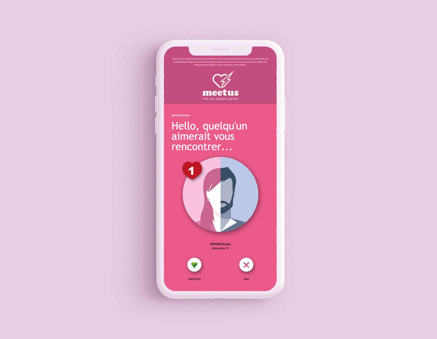 Bon on ne va pas en rajouter, vous l'avez bien compris : Pepper ne s'est pas reconverti en entremetteur pour Directeurs Artistiques ni en fournisseur d'expériences extra-conjugales. Nous avons juste détourné le concept de l’appli et du site de rencontre pour une opération de self-promo en mode humour et décalé pour présenter notre agence. Un stratagème conçu en 2 temps, avec l’envoi d’un premier mail de notification façon réseaux sociaux, renvoyant sur une page web (landing page) construite et désignée en reprenant les codes utilisés sur les sites de speed dating. Le tout en responsive pour être lu sur mobile et ordinateur.